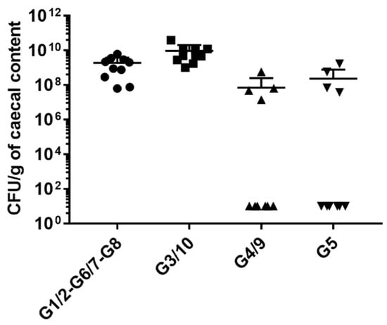 In mice inoculated with Symbioflor2®, the colonization level of each of the E. coli genotypes was quantified by cultivation and subsequent multiplex PCR using grown colonies from the cecal content of gnotobiotic mice. Strain-specific probes, which enabled the specific detection of E. coli Symbioflor2® components, were designed from the genome sequences. However, no specific PCR primer sets could be found to detect the genotypes G1-2, G6-7, and G8 individually. Thus, a single primer pair was developed to detect these three genotypes together. Three other specific primer pairs were designed to detect the genotypes G3-10, G4-9, and G5, individually. The sequences of the forward and reverse primers are given in the Table S1 (Supplementary Materials).