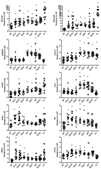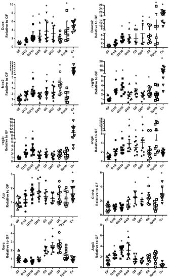 We performed a multivariate statistical test to identify genes whose expression was significantly different between GF and both the mono-associated groups and the Symbioflor2® group. The lists are given in the Tables S4 and S5 (Supplementary Materials) for the ileum and the colon, respectively. In the ileum, we found that 13, 35, 21, 29, 36, and 32 genes were differentially expressed between the GF and the G1/2, G3/10, G4/9, G5, G6/7, and G8 mono-associated mice. Nine genes differed between the GF and the Symbioflor2®-associated mice. In the colon, 16, 24, six, 27, 28, and 29 genes were differentially expressed between the GF and the G1/2, G3/10, G4/9, G5, G6/7, and G8 mono-associated mice. Eleven genes differed between the GF and the Symbioflor2®-associated mice. The genes involved in ROS/RNS turnover, anti-microbial peptide production, immune responses, detoxification, and mucosal fortification are altered by inoculation of all genotypes. The gene expression of several solute transporters, involved in ionic transport, and possibly luminal environment regulation, are also modulated by the strains.