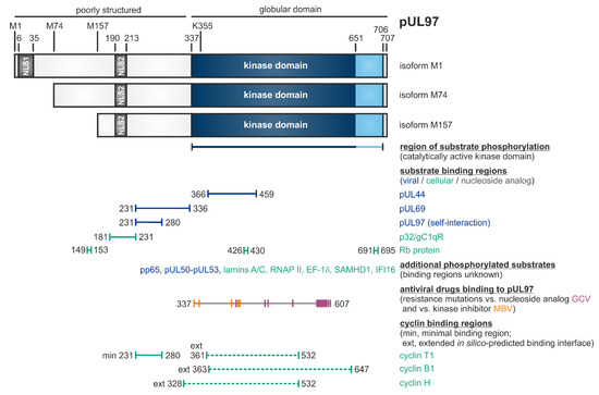 Notably, pUL97 phosphorylates several viral and cellular proteins (see horizontal bars in Figure 1 for those binding regions within pUL97 that have been mapped thus far), including the viral DNA polymerase cofactor pUL44 [122], viral RNA transport factor pUL69 [79], major tegument protein pp65 [95], nuclear egress core proteins pUL50-pUL53 [99,127], cellular multiligand binding protein p32/gC1qR [98,122], tumor suppressor protein Rb [75], nuclear lamins A/C [57,84,94,98,129], RNAP II [100], translation factor EF-1δ [63,101,130], interferon-inducible, intrinsic immune restriction factors IFI16 [96] and SAMHD1 [105] (Figure 2; Table 3; compare with Tables S1–S3).