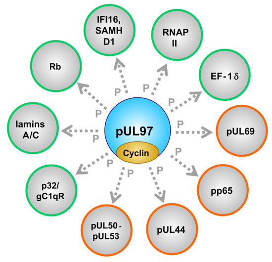 The cytomegalovirus-encoded CDK-like protein kinase pUL97 interacts with cyclins and phosphorylates a number of viral (encircled in orange) and cellular (encircled in green) substrate proteins.