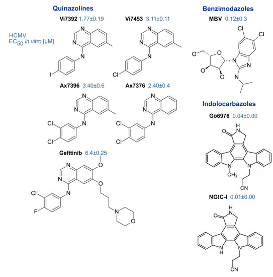 - Herget, T.; Freitag, M.; Morbitzer, M.; Kupfer, R.; Stamminger, T.; Marschall, M. Novel chemical class of pUL97 protein kinase-specific inhibitors with strong anticytomegaloviral activity. Antimicrob. Agents Chemother. 2004, 48, 4154–4162. [Google Scholar] [CrossRef] [PubMed]