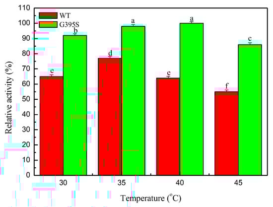 Effects of temperature on the activities of the tryptophan synthase mutant and wild type. Relative activity of the tryptophan synthase mutant (G395S) and wild type (WT) catalyzing reactions at different temperatures (30, 35, 40, and 45 °C), L-serine concentration of 50 mmol/L, pH of 8, 12 h. The Error bars were mean values of three independent replicate. The meaning of letters a, b, c, d, e, f, in the figure legend indicates significant differences.