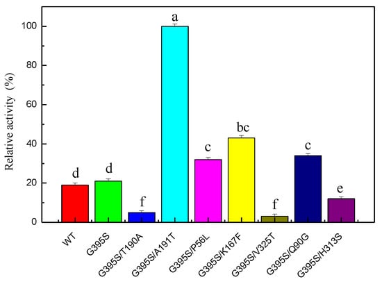 Relative activities of glycine-substituted mutants of tryptophan synthase. The reaction conditions for the mutated enzyme were an L-serine concentration of 50 mmol/L, a reaction temperature of 40 °C, pH of 8, 12 h. The Error bars were mean values of three independent replicate. The meaning of letters a, b, c, d, e, f, in the figure legend indicates significant differences.