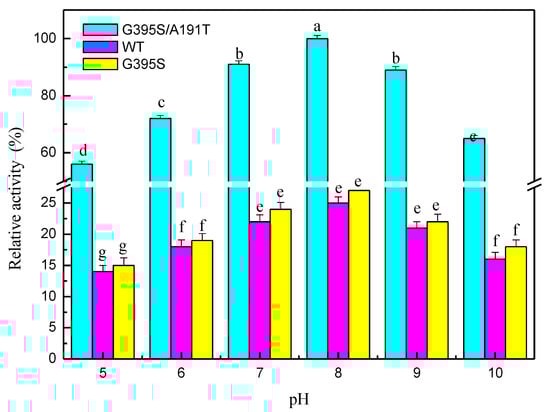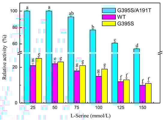The mutated enzymes reacted at different pH values, and the results showed that the mutant enzyme G395S/A191T had the highest activity at pH 8. The optimal pH value of the mutant enzyme G395S and the parental enzyme was also 8, but the activities of the mutant enzyme G395S and parental enzyme were lower than that of the mutant enzyme G395S/A191T (Figure 3). These results showed that the mutant enzyme G395S/A191T maintained high activity in the L-serine concentration range of 25, 50, and 75 mmol/L, while the optimal L-serine concentration of the mutant enzyme G395S and parent enzyme was approximately 50 mmol/L (Figure 4). Under the reaction conditions of an L-serine concentration of 50 mmol/L, the production of L-tryptophan was determined by an Amino Acid Analyzer (Hitachi L-8900, Japan). Synthesis of L-tryptophan by the mutant enzyme G395S/A191T was higher than that by the mutant enzyme G395S and parental enzyme (Figure 5).