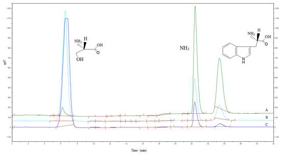 Synthesis of L-tryptophan by the three strains. The reaction conditions for three tryptophan synthase recombinant strains ((A): G395S /A191T; (B): G395S; (C): Wild strain) were an L-serine concentration of 50 mmol/L, reaction temperature of 40 °C, pH of 8, 12 h. Red line was the integral line.