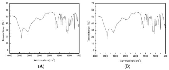 FTIR spectrum of L-tryptophan. ((A): Reaction product; (B): Standard substance).