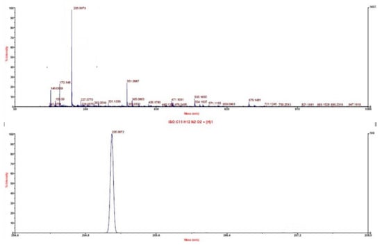 The infrared spectrum of L-tryptophan is shown in Figure 6, with the introduction of amino and carboxyl groups. The 1H-NMR spectrum of L-tryptophan is shown in Figure 7. 1H NMR (500 MHz, D2O): δ 3.23(s, 3H), 3.41 (d, 2H), 3.97 (t, 1H), 7.12 (d, 1H), 7.21 (d,1H), 7.45 (m, H), 7.64 (m, H). The theoretical molecular weight of L-tryptophan is 204 Da. As shown in Figure 8, a signal at m/z 205 appeared in the mass spectrum of the reaction mixture, which is consistent with ionized L-tryptophan (Figure 8).