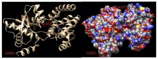 Appropriate modifications of the amino acid residues in the substrate channel can promote the recognition and binding abilities of the enzyme. Through a combination of temperature factor analysis and substrate channel localization, key amino acid residues that affect both the thermal stability and catalytic activity of the enzyme can be identified. In combination with saturation site-specific mutation and screening, target mutant enzymes with improved thermal stability and catalytic activity can be obtained from all the possible mutations. Chimera1.13 was used to analyze the substrate channel space of the enzyme, and it was found that the amino acid at position 395 was located in a loop involved in substrate channel formation (Figure 9). After the mutation of this amino acid from glycine to serine, the spatial orientation freedom of the main chain was reduced, the rigidity of the enzyme was increased, and the thermal stability of the enzyme was improved. Alanine at position 191 was mutated to threonine, which may have changed the folding direction of the loop, thus changing the shape and size of the substrate channel entrance and increasing enzyme activity (Figure 9).