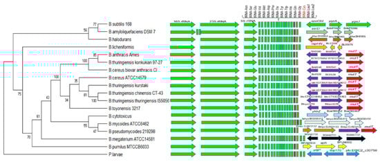 tRNACys gene region analysis for the Bacillus cereus group and some related species. 16S, 23S, 5S rRNA, and the cluster of 15 to 17 tRNA genes found downstream of the 5S rRNA gene are shown. tRNACys is in red color in the tRNA gene cluster and the orientation of three or four specific genes located downstream of tRNACys is shown in various other colors. For our PCR strategy, we used the second yebC/pmpR gene (which encodes a probable transcriptional regulatory protein) located downstream from tRNACys and between the first gene sequence (protein of unknown function) and the mutT-like gene (7,8-dihydro-8-oxoguanine-triphosphatase) indicated with purple and red colors, respectively. The sequences from these regions were obtained and analyzed in MEGA X, using the Neighbor-Joining method. Paenibacillus larvae was designated as the outgroup taxon.