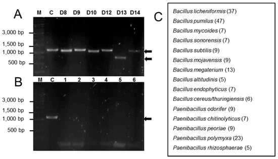 B. cereus s.l. detection in commercial bee pollen. (A) Panel A show positive results of the tRNACys-PCR analyses for isolates D8 to D14 and (B) panel B show negative results for tRNACys-PCR (see text for bacterial species identified for lanes 1 to 6). Lane M contains a Thermo Scientific GeneRuler 1 Kb DNA ladder, lane C is the control (B. cereus ATCC 10876), and the arrows show the PCR amplification product. (C) Bacterial species identified by MALDI-TOF MS; numbers in parentheses indicate the total number of isolated colonies identified.