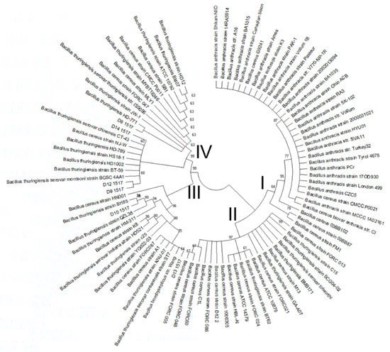 Phylogenetic analysis in MEGA X, using the Neighbor-Joining method. tRNACys- yebC/pmpR genes sequences of the isolates were compared with sequences of B. cereus group obtained by BLAST search in the NCBI, GenBank database (http://www.ncbi.nlm.nih.gov) and representative strains were selected for the analysis. The bootstrap consensus tree inferred from 1000 replicates is taken to represent the evolutionary history of the taxa analyzed. Branches corresponding to partitions reproduced in less than 50% of the bootstrap replicates are collapsed. Group I contained almost exclusively species that were closely related to B. anthracis, while groups II, III, and IV contained species phylogenetically related to B. cereus and B. thuringiensis. The isolated colonies obtained are shown as D8 1517, D9 1517, D10 1517, D12 1517, D13 1517, and D14 1517 appearing within groups III and IV.