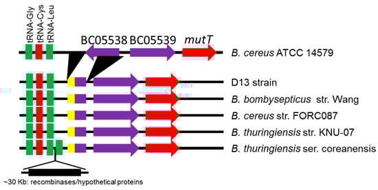 Analysis of the tRNACys region for strain D13 and species closely related phylogenetically. Deletion of sequences is indicated by black triangles compared with B. cereus ATCC 14579. Insertion of ~30 Kb for B. thuringiensis ser. coreanensis is indicated by the black rectangle. The yellow color indicates insertion sequences detected.