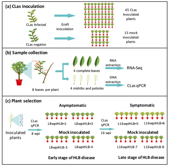 Flowchart of the experimental design used to inoculate Candidatus Liberibacter asiaticus (CLas) in C. aurantifolia and to select plants to be included in the 8 libraries for RNA-seq analysis. (a) CLas inoculation by grafting. Forty-five Mexican lime plants were inoculated with CLas-positive budwood, and 15 plants were inoculated with CLas-free budwood as controls; (b) sample collection of 8 leaves per plant for RNA and DNA extraction. In all cases, the fourth leaf of 8 different branches located at third level of ramification from the main stem was collected in order to obtain a homogeneous representation of source tissue; (c) plant selection by qPCR at 8 and 16 wpi (weeks post inoculation) to construct each library. Libraries L8wpiHLB+1 and L8wpiHLB+2 included 5 pooled asymptomatic plants. Libraries L16wpiHLB+5 and L16wpiHLB+6 included 5 pooled symptomatic plants. Control libraries, L8wpiHLB-3 and L8wpiHLB-4 at 8 wpi and L16wpiHLB-7 and L16wpiHLB-8 at 16 wpi, were constructed by pooling 5 mock-inoculated plants.