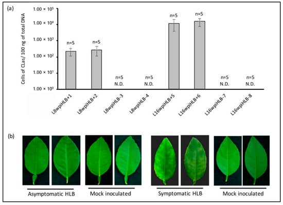 CLas titer quantification and symptoms of selected samples for RNA-seq analysis. (a) Bacterial titer in Mexican lime leaves of the five individual plants included in each library at 8 and 16 weeks post-inoculation (wpi). L8wpiHLB+1 and L8wpiHLB+2 are two replicates of asymptomatic plants at 8 wpi. L16wpiHLB+5 and L16wpiHLB+6 are two replicates of symptomatic plants at 16 wpi. L8wpiHLB-3 and L8wpiHLB-4 are control plants (mock-inoculated) at 8 wpi, and L16wpiHLB-7 and L16wpiHLB-8 are control plants (mock-inoculated) at 16 wpi. For each bar, standard deviation is shown. N.D: not detected. (b) Representative pictures of Mexican lime leaves used as source of biological material in the present study.