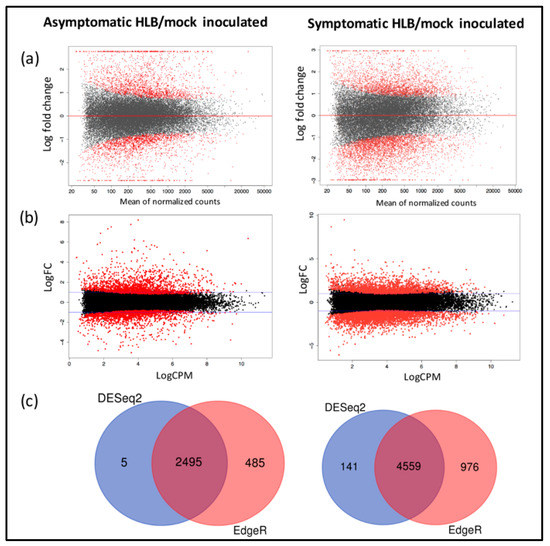 Mexican lime differential gene expression in asymptomatic (early) and symptomatic (late) stages of Huanglongbing (HLB) disease. Log ratio versus abundance plots (MA-plot) for both infection stages using DESeq2 (a) and EdgeR (b) algorithm. (c) Venn diagram of differentially expressed transcripts using both algorithms.
