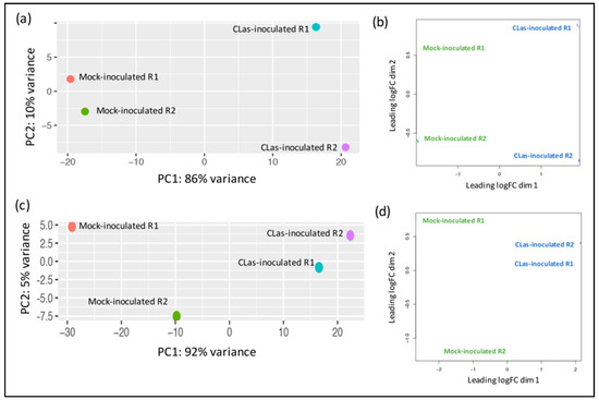 Principal component analysis (PCA) of gene expression from RNA-seq derived data. (a,c) PCA performed using DESeq2 log-normalized RNA-seq data in asymptomatic and symptomatic stages, respectively. Loadings for principal components 1 (PC1) and PC2 are reported in graph (on x- and y-axes); (b,d) PCA performed using EdgeR log-normalized RNA-seq data in asymptomatic and symptomatic stages respectively.