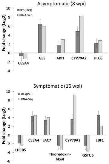 To validate the data obtained from RNA-Seq analysis, transcript expression of 10 selected genes was evaluated by quantitative reverse transcription PCR (RT-qPCR). The chosen genes (three deregulated at early stage, five at late stage and two at both stages) were selected from the significantly enriched pathways according PageMan analysis, including cell wall metabolism, hormone signaling, light reactions, secondary metabolism, biodegradation of xenobiotics, ubiquitin-dependent protein degradation, signaling, and redox reactions. The genes CESA4 (Cellulose synthase A catalytic subunit 4) and CYP79A2 (Cytochrome p450 79a2) belonging to cell wall metabolism pathways and biodegradation of xenobiotics family, respectively, were analyzed at both stages. At asymptomatic (early) stage, the genes GES (E,E-geranyllinalool synthase), ABI1 (ABA Insensitive 1), and PLC6 (Phosphoinositide phospholipase C 6), belonging to secondary metabolism of isoprenoids, hormone signaling pathways, and signaling of phosphinosites, respectively, were analyzed. Finally, at symptomatic (late) stage, the genes LHCB5 (Chlorophyll a-b binding protein), LAC7 (Laccase 7), Thioredoxin-like 4 protein, GSTU6 (Glutathione S-transferase TAU 6), and EBF1 (EIN3-binding F-box protein 1), belonging to light reactions, secondary metabolism of phenols, redox reactions, and ubiquitin-dependent protein degradation, respectively, were analyzed. RT-qPCR analysis revealed expression patterns similar to the results obtained from RNA-seq for the 10 analyzed genes (Figure 5). To determinate the statistical significance of data obtained from RT-qPCR and RNA-seq, a chi-square test was performed to compare the fold-change results obtained from both methods. A p-value of 4.33 × 10−7 for the population of genes evaluated at both asymptomatic and symptomatic stages was observed, showing high correlation between data obtained from RT-qPCR and RNA-seq. These results confirm the accuracy and reliability of data generated from RNA-Seq analysis.