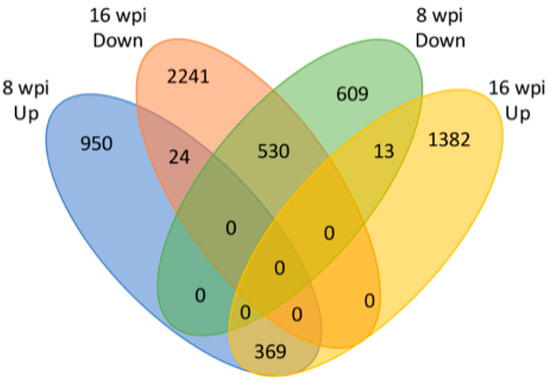 Venn diagram of total number of upregulated and downregulated genes in asymptomatic (8 wpi) or symptomatic (16 wpi) stages of HLB disease.