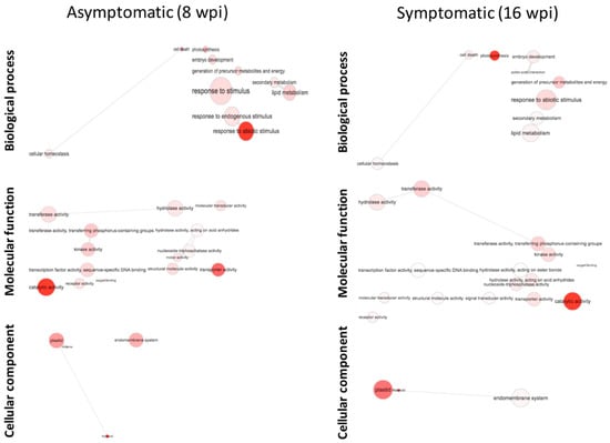Of the 2495 deregulated DEGs at asymptomatic stage, 1343 were significantly upregulated and 1152 downregulated. On the other hand, in symptomatic stage, of the 4559 deregulated DEGs genes, 1764 were upregulated and 2795 downregulated (Figure 6). Only 936 genes were commonly deregulated between the asymptomatic and symptomatic stages: 369 were upregulated and 530 downregulated. The remaining 37 genes showed inverse behavior between stages: 24 genes were upregulated at asymptomatic stage but downregulated at symptomatic stage, whereas 13 genes were downregulated at asymptomatic stage and upregulated at symptomatic stage (Figure 6). Gene ontology (GO) assignments were used to classify the functions of DEGs at both early and late stages of HLB infection. A total of 25 functional groups at both stages were classified in Biological process, 10 in Molecular function, and 13 in Cellular component. The functional categories with the highest number of genes (>400 genes) were cellular process, metabolic process (from Biological process), binding, catalytic activity, and transferase activity (from Molecular function), and cell, cell part, cytoplasm, intracellular, membrane, organelle, and plastid (from Cellular component). Remarkably, for all categories, a higher number of genes were deregulated at symptomatic stage compared with the deregulated at asymptomatic stage (Figure S1). After that, we performed a GO terms enrichment analysis. At asymptomatic stage, the most significantly enriched GO terms for Biological process were related to response to stimulus (GO:0050896), generation of precursor metabolite and energy (GO:0006091), lipid metabolic process (GO:0006629), and cellular homeostasis (GO:0019725). For GO terms in Molecular function, the most significantly enriched GO terms were catalytic activity (GO:0003824), transferase activity (GO:0016772 and GO:0016740), and hydrolase activity (GO:0016787), and for Cellular component, endomembrane system (GO:0012505) and ribosome (GO:0005840) (Figure 7). On the other hand, at symptomatic stage, the most significantly enriched GO terms for Biological process were response to abiotic stimulus (GO:0009628), generation of precursor metabolites and energy (GO:0006091), embryo development (GO:0009790), and lipid metabolic process (GO:0006629). For GO terms in Molecular function, these were: catalytic activity (GO:0003824), transferase activity (GO:0016740 and GO:0016772), and hydrolase activity (GO:0016787), and for Cellular component, thylakoid (GO:0009579), endomembrane system (GO:0012505), and plastid (GO:0009536) (Figure 7).