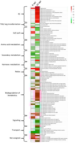 Metabolic pathways categorization analysis. PageMan functional enrichment of differentially expressed genes. Red, downregulated functional categories; green, upregulated functional categories.