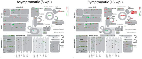 PageMan [30] analysis tool was used to obtain a statistics-based overview of pathways altered during the different stages in response to CLas infection (Figure 8). PageMan can pinpoint upregulated and downregulated expressed genes onto different metabolic and cell function pathways. A total of 10 metabolic pathways were identified through PageMan analysis. Increased expression of genes related to Krebs cycle (TCA and minor carbohydrate metabolism), amino acid (central amino acid, glutamate, proline, and aspartate metabolism), secondary metabolism (isoprenoids, phenylpropanoids, flavonoids, and phenols), transport (v-ATPases, ABC, and multidrug resistance systems and major intrinsic proteins), and hormone metabolism (abscisic acid metabolism and ethylene degradation), was observed at both asymptomatic and symptomatic stages. Transcriptional repression was predominantly observed in photosynthesis (photosystem I and II, LHC complex, electron carrier, light reaction NADH, and cyclic electron flow, and Calvin cycle) and redox (tetrapyrrole synthesis, redox glutaredoxins and nucleotide metabolism) at late stage. For cell wall, a subset of genes were repressed (Arabinogalactan proteins, AGPs) and the other subset induced (lipid metabolism fatty acid desaturation) at early stage, whereas a subset of genes from the same category were only induced at late stage (cellulose synthesis, pectin esterase, and lipid metabolism fatty acid desaturation). Biodegradation of xenobiotics category showed both induction and repression of genes at both stages. At asymptomatic stage, genes related to biodegradation of xenobiotics, cytochrome p450, regulation of transcription zinc finger and WRKY family, and protein synthesis were upregulated, whereas regulation of transcription JUMONI family and protein degradation and folding were downregulated. At symptomatic stage, members of genes related to peroxidases, helicases, regulation of transcription zinc finger and chromatin remodeling factor family, protein posttranslational modification, and ubiquitin-dependent degradation were upregulated, and the genes belonging to rhodanase, regulation of transcription NAC domain and sigma-like family, and protein synthesis, folding, and assembly were downregulated. Finally, a group of genes not assigned showed a repression trend at both stages. After that, MapMan software was applied to display and analyze the functional classes of metabolic pathways significantly different at both early and late stages in response. MapMan provides an overview of pathways and functions identified by PageMan, where each colored square represents a single annotated gene in particular pathway. As shown in Figure 9, at asymptomatic stage, secondary metabolism of isoprenoids, cell wall proteins (arabinogalactan proteins), light reactions, amino acid metabolism, and lipid metabolism are the major categories in which genes are differentially expressed. At symptomatic stage, light reactions, Calvin cycle, cell wall (pectin esterases and cellulose), lipid metabolism (glycolipid synthesis and fatty acid desaturation), nucleotide metabolism, secondary metabolism (phenols and phenylpropanoids), and amino acid metabolism (aspartate) were deregulated.