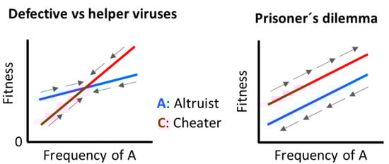 Two examples of altruistic-cheater virus interactions. Both defective-helper systems and Prisoner´s dilemma exhibit frequency-dependent selection, but they differ in the arrangement of fitness values, leading to different population dynamics. Defective viruses cannot reach fixation because they ultimately depend on helper variants. In contrast, in Prisoner´s dilemma, the cheater fully outcompetes the altruistic variant. Arrows indicate the direction of selection.
