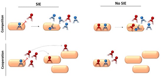 The evolutionary significance of superinfection exclusion remains obscure in most cases. A null hypothesis is that exclusion needs not to be an adaptive process, but could simply be a byproduct of the extensive changes experienced by the infected cell. However, since some phages (and other viruses) have specific genes that control superinfection exclusion, it is reasonable to postulate that this may be a selectively advantageous trait. The most intuitive evolutionary explanation for superinfection exclusion is that it allows the actor virus to prevent competition for resources exerted by incoming viruses. Yet, it is also possible that superinfection exclusion may function as a cooperative trait that benefits the excluded virions by preventing them from entering already infected cells and allowing them to search for alternative cells containing more available resources (Figure 4). This was indeed postulated in a study with vaccinia virus, in which virus-encoded proteins were shown to mediate repulsion of virions from the surface of the infected cell, which could subsequently reach other, uninfected cells, speeding up viral spread [34]. Under the cooperation hypothesis, the actor virus would pay the cost of actively preventing superinfection and of helping other members of the population reach susceptible cells that would otherwise be available to the actor´s progeny. Hence, superinfection exclusion would be favored by selection only if the excluded viruses shared high genetic relatedness with the actor (cooperator assortment). Interestingly, superinfection exclusion is known to work best among highly related viruses.