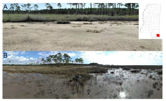 Saltpan wetland within the Grand Bay National Estuarine Research Reserve (GBNERR) on the Mississippi Gulf coast in June 2018 (A) under the desiccated state and in October 2018 (B) following a storm tide. The storm tide was generated by Tropical Storm Gordon, which made landfall east of Pascagoula, Mississippi on September 5, 2018.
