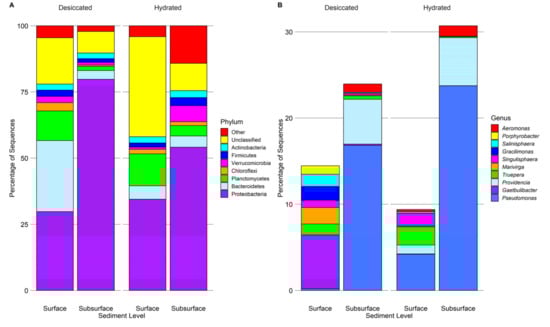 Bacterial sequences clustered into 3352 OTUs, of which 1463 were represented by only a single sequence. Among the highest represented OTUs in the dataset, 14 contained >1000 sequences and together accounted for almost 45% of all sequences. The first, second, and seventh most abundant OTUs were each classified to the family Enterobacteriaceae, while other predominant bacterial OTUs were members of the Pseudomonadaceae, Flavobacteriaceae, Rhodobacteraceae, Rhodothermaceae, and Sphingomonadaceae. Both bacterial species richness (Sobs) and diversity (Inverse Simpson) were similar between the surface and subsurface layers, and neither showed significant differences based on hydration state (p = 0.47–0.93; ANOVA). Average species richness was 254.6 ± 5.1 for desiccated surface sediments, 116.6 ± 24.4 for desiccated subsurface sediments, 198.5 ± 21.7 for hydrated surface sediments, and 218.3 ± 145.7 for hydrated subsurface sediments. Average inverse Simpson diversity was 58.9 ± 31.8 for desiccated surface sediments, 7.8 ± 2.4 for desiccated subsurface sediments, 21.6 ± 2.8 for hydrated surface sediments, and 80.6 ± 75.1 for hydrated subsurface sediments.