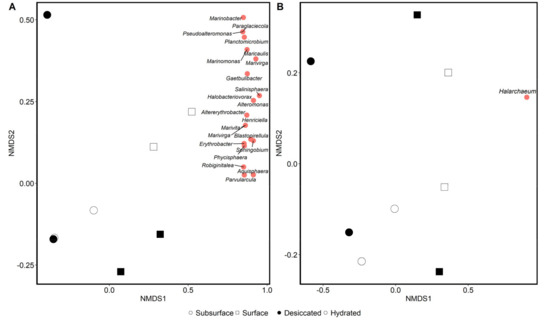 Non-metric multidimensional scaling (NMDS) ordination of bacterial (A) and archaeal (B) communities in saltpan wetland sediments collected from the Mississippi Gulf Coast. Sediment was collected from the surface and the 30 cm subsurface. Duplicate cores were taken from the same site in a desiccated state and flooded state. Ordinations are based on Bray–Curtis dissimilarity matrices derived from 16S rRNA gene sequence data. Red circles indicate genera that were most influential in separating samples and the position in the NMDS ordination that they pulled samples toward. Only one operational taxonomic unit (OTU) (Halarchaeum) was influential in separating archaeal communities.