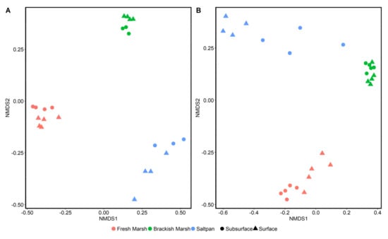 The microbial communities from the saltpan site were compared against those in sediment at freshwater and brackish marsh sites also located at GBNERR. A Bray–Curtis distance matrix and NMDS ordination (Figure 4) clearly separated sequences into three distinct clusters by wetland type, as microbial sequences at each of the three wetland types differed significantly in archaeal and bacterial composition (p < 0.001 for both). As with the saltpan site alone, the effect of soil depth was also a significant factor across all three wetland classes for both the bacterial (p = 0.029; PERMANOVA) and archaeal communities (p = 0.037).