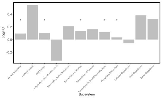 Differential abundance of MetaCyc subsystems in microbial communities in saltpan wetland sediment when hydrated compared to desiccated. Log2FC, fold change, represents the shift from the desiccated to the hydrated state and those functional groups which were represented by more amplicons following the flood event show positive change and those which had fewer amplicons show negative change. MetaCyc enrichment analysis determined which functional groups showed a significant change (*), based on the raw number of daughter pathways which changed in amplicon number.