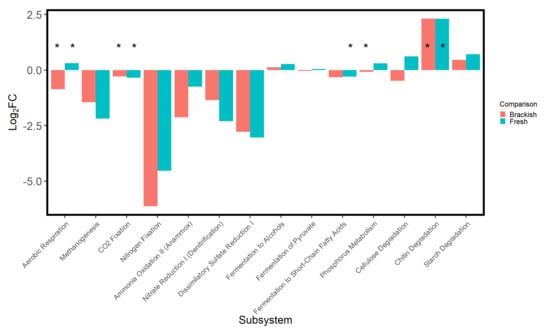 Differential abundance of MetaCyc subsystems in microbial communities in brackish and tidal fresh wetlands as compared to a saltpan wetland in the same area of Grand Bay National Estuarine Research Reserve in southeast Mississippi, USA. Log2FC was used as a measure, of which functional groups had more or fewer pathways expressed when comparing each tidal wetland to the saltpan based on differences in the taxa present. Fold change represents the difference between the saltpan amplicon counts and the amplicons counts of the brackish (red) and fresh (blue) tidal wetlands. Those functional groups which were represented by more amplicons in either the brackish or fresh wetland show positive change and those which had more amplicons in the saltpan sediment show negative change. MetaCyc enrichment analysis determined which functional groups showed a significant difference (*), based on the raw number of daughter pathways which differed in amplicon number.