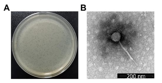 To observe the virion morphology of the phage, the phage plaques formed on the agar plate were washed off by using an SM buffer (10 mM Tris, 100 mM NaCl, and 10 mM MgSO4, pH 7.5) and further filtered through a 0.22 μm pore-size membrane filter for use. After negative staining with 2% potassium phosphotungstate (pH 7.2), the phage morphology was imaged by transmission electron microscopy (TEM, G20, Tecnai, FEI, Hillsboro, OR, USA) at an acceleration voltage of 200 kV [36].