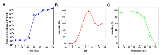 The temperature stability of the isolated phage was determined at 4 °C, 28 °C (representing room temperature for phage storage), 37 °C, 50 °C, 60 °C, and 70 °C, respectively, by placing the newly prepared phage suspension at each temperature for 30 min. The newly prepared phage suspension was stored at 4 °C, and the phage concentration was 1013 PFU/mL before treatment. After the treatment, the phage suspension was cooled slowly, and the titers of the phage in each treated suspension were determined by the double-agar overlay method. The pH tolerance of the isolated phage was tested by incubating the phage in buffers with a pH of 1.0, 3.0, 5.0, 7.0, 9.0, and 11.0 for 30 min at 28 °C. The results were expressed as a percentage of the initial viral counts. For each assay, the phage was treated by different treatments once, the phage titer was tested three times, and the means were used.