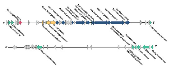 The functional analysis of the phage ORFs showed that the genes of the phage form a modular structure, including the modules that encode the structural gene cluster (12 ORFs), the DNA packaging associated gene cluster (3 ORFs), the nucleic acid metabolism associated gene cluster (10 ORFs), and the host cell lysis associated gene cluster (2 ORFs) (Figure 3). Genes with associated functions were located close together in the genome, which might benefit the regulation of the phage’s life cycle after infecting the host bacterium. Except for the genes associated with the metabolism of nucleic acids, the other three gene modules were transcribed in the same direction and in the same DNA strand. The different transcription directions and locations of the genes associated with the metabolism of nucleic acids might be due to the different expression times of these genes after infection.