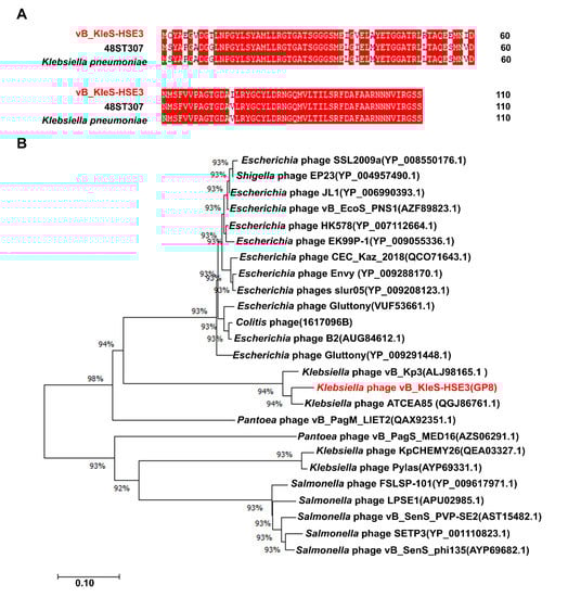 Analysis of the functional proteins Gp52 and Gp8 of the vB_KleS-HSE3 phage. (A) Alignment of the protein Gp52 with the proteins of the Klebsiella phage 48ST307 (Genbank Accession No. AQN32348.1) and the K. pneumoniae bacterial strain (Genbank Accession No. WP_135718102.1). (B) Phylogenetic analysis of the lysins that showed a high similarity to the lysin of the vB_KleS-HSE3 phage. The phylogenetic tree was generated by using the neighbor-joining method and bootstrap analysis (1000 replicates) in MEGA X. Only lysins that showed more than a 40% similarity with Gp8 were used. The scale bar represents 0.10 substitutions per nucleotide position.