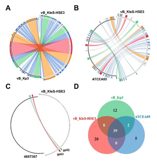Comparative genomic analysis of the Klebsiella vB_KleS-HSE3 phage. The genome sequence of the Klebsiella vB_KleS-HSE3 phage was compared with that of the Klebsiella phage vB_Kp3 (A), ATCEA85 (B), and 48ST307 (C). The results were visualized using Circoletto, and the similar genome regions are shown in the same color. (D) The core gene analysis of Klebsiella phage vB_KleS-HSE3, vB_Kp3, and ATCEA85.