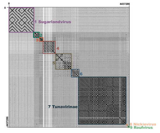 To further analyze the genome similarities of the phages that infect Klebsiella genus bacterial strains, the genomes of all 80 Klebsiella phages belonging to the Siphoviridae family were compared by a dot plotting analysis (Figure 6). According to the results, 80 Klebsiella phages were classified into nine clusters; the phage vB_KleS-HSE3 together with the Klebsiella phage vB_Kp3 and ATCEA85 were grouped together as a novel phage cluster. The phages belonging to the cluster of the vB_KleS-HSE3 phage rarely exhibited similarities to the phages of the other groups, suggesting that the phages of this cluster represent a novel phage lineage.