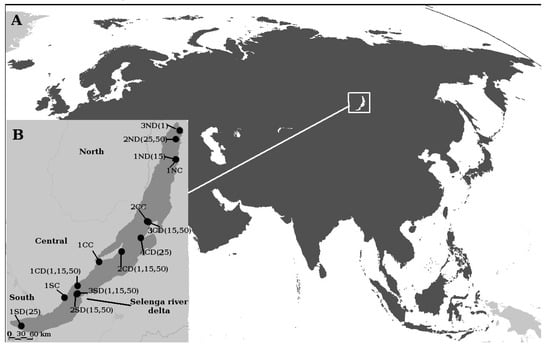 A. Lake Baikal position in Eurasia, B. Sampling sites in Lake Baikal. For each sample, the first number and letter indicates the number within one of the basins (S—Southern, C—Central, N—Northern basins), the second letter indicates coastal (C; up to 40 m depth) or deepwater (D; more than 100 m depth) sites, and numbers within brackets indicate the sample depth (e.g., 1CD (1, 15, 50) means of samples from 1, 15, and 50 m depths that were taken in the first site of the Central basin at a deep site. No depth is shown for the coastal samples.