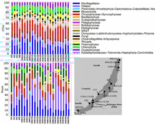 A total of 2,284,061 quality-filtered reads were obtained from 23 water samples (Figure 1). They grouped into 1414 protistan and 37 metazoan OTUs delineated using a cut-off value of 99% of sequence identity. The metazoans belonged to known Baikal multicellular organisms (mainly copepoda). The protistan OTUs were analysed according to their relative abundance [51]. In total, 24 OTUs were abundant (>1% of all reads), 1129 OTUs were rare (<0.01%), and 317 OTUs had intermediate abundances (0.01% < OUT < 1%). Among the rare OTUs, only 344 OTUs were represented by less than 10 reads, while others were represented by up to 230 reads. The rarefaction curves (Figure S1) indicated that we approached diversity saturation.