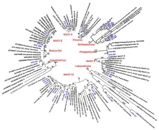 Among Stramenopiles, members of four MAST groups were found (Figure 4, Figure S4). Baikal members of MAST-3J and MAST-6 were similar to sequences from a pond in the Natural Regional Park (France). Baikal MAST-2A was identical to a previously sequenced clone from Baikal (JN547283) and identical also to a sequence from Lake Kusaki (Japan). MAST-12 was more diverse and included 11 OTUs from MAST-12C and three OTUs from MAST-12A and -12B (Figure 4, Figure S4). There were several OTUs that could also belong to MAST: one OTU clustered with MAST-6 and three OTUs clustered with MAST-24 with low bootstrap support (Figure S4). Labyrinthulomycetes, which are mostly marine protists, were represented in Baikal by two OTUs, one of which was similar to an unclassified freshwater sequence from a French pond and another one that clustered with a sequence from a lake in Villerest (France) (Figure 4, Figure S4). A few OTUs had similarity with the Pirsonia clade, but bootstrap support was only 58 (Figure 4, Figure S4). Bolidophyceae, which are common in the ocean but mostly absent in freshwater environments [53], were represented by 10 OTUs in Lake Baikal (Figure 4, Figure S2). Lastly, two OTUs clustered with strong statistical support with marine Cercozoa from the Mataza group (Figure 4, Figure S5).