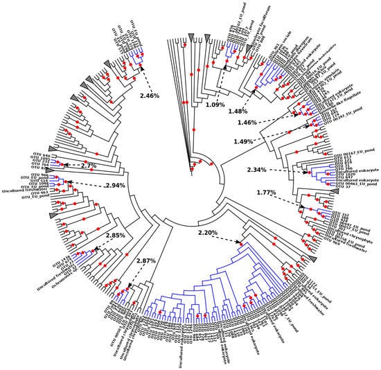 Besides high rank taxa, “marine elements” at the genus/species level were identified in Lake Baikal. In particular, two Baikal ciliates (OTU_27, 16,574 reads and OTU_579, 25 reads) and one green algae (OTU_532, 35 reads) were very similar to counterparts from the Baltic Sea (Figures S6 and S7). Also, OTU_80 (3848 reads) from Lake Baikal was identical to the sequence of an unclassified ciliate from the Bering Sea, while another Baikal ciliate (OTU_1062, 6 reads) was similar to an environmental marine sequence collected near Norway (Figure S4). One of the Telonema-like OTUs (OTU_73) clustered exclusively with Telonema antarcticum and several uncultured marine eukaryotes (Figure S8). Among them, OTUs from the brackish Arctic Ward Hunt Lake were identical to the OTU_73 from Lake Baikal, which was found in 18 samples and corresponded to 0.2% of all reads in Lake Baikal (4495 reads in total). The diatom Thalassiosira pseudonana, known from brackish waters [54], was also found in our data (Figure S2). Furthermore, OTU_299 (155 reads; Figure S10) was identical to Naganishia vishniacii (Cryptococcus vishniacii), which is an enigmatic protist from Antarctic soil [55] but was also found in the meltwater from Tianshan glacier [56].