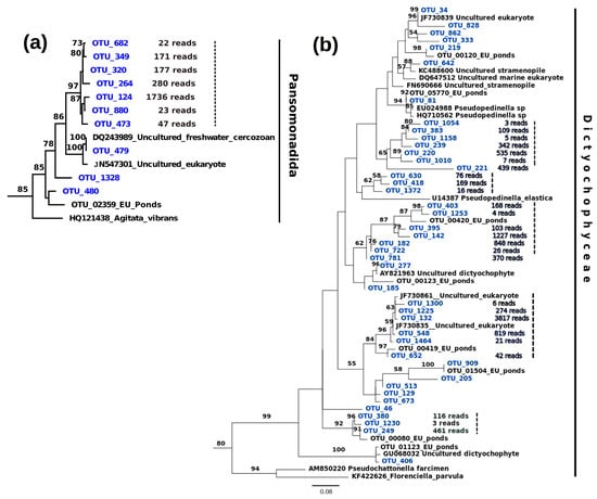 (a) Potential species flock in Pansomonadida (Rhizaria), which includes 7 OTUs differing > 10% from any known DNA sequence; (b) Potential species flocks in Dictyochophyceae (see full tree in Figure S3). Baikal OTUs are shown in blue. The number of total reads, considering all samples, are shown for each Baikal OTU from the flocks. Flocks are shown with a dashed line.