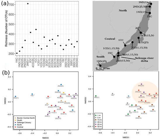 It has been shown that the structure of Baikal microbial communities in spring is affected by lake topography [28]. In our study, summer communities differed from each other, but we did not observe a clear correlation with the lake’s topography. However, we found that Baikal communities may be influenced by riverine inputs as surface communities near the delta of the Selenga river clustered together. Also, the community from site 3ND (Figure 7a), which is under the influence of two big rivers, had a higher species richness than the rest of the samples, pointing to community coalescence [92]. In addition, we found that depth influenced community composition as surface communities differed from those at 25–50 m depth. Previously, it was shown that picophytoplankton decreased in the 20–30 m samples compared to the 5 m depth samples in July [91].