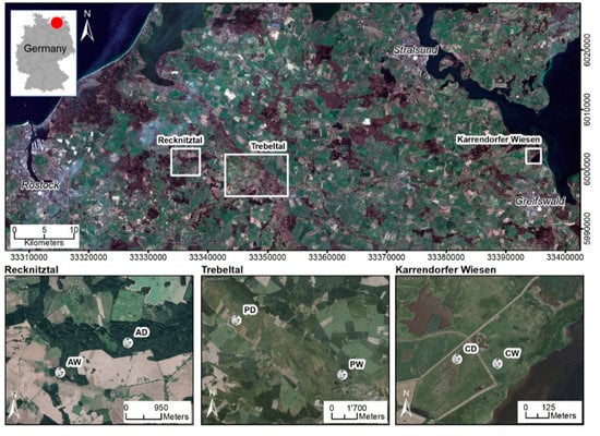 All sampling sites, alder carr, coastal fen, and percolation fen, were located in northeastern Germany (Figure 1). The alder carr is part of the Recknitz river valley, which has been drained since at least 1786 and has been used as a managed forest. The rewetted subsite (Alderwet) (54°13′ N 12°49′ E) was unintentionally flooded in 1999 due to a blocked drain and has remained wet since then. In the drained subsite (Alderdry) (54°13′ N 12°51′ E), long-term deep drainage has caused subsidence of the soil surface by about 1 m.