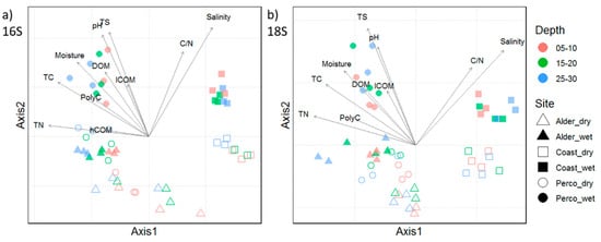 NMDS plots showing (a) prokaryotic and (b) eukaryotic community compositions. Symbols show triplicates of cores and indicate the study sites; the color indicates the depth in cm (see legend). Environmental vectors with a significance of p < 0.05 are shown in black. TN: total nitrogen, hCOM: humic like carbon, TC: total carbon, PolyC: carbon polymers, DOM: dissolved organic matter, lCOM: low-molecular-weight organic matter, TS: total sulfur, C/N: carbon/nitrogen ratio. Triangles: alder, squares: coast, circles: Perco. Open symbols: dry, filled symbols: wet.