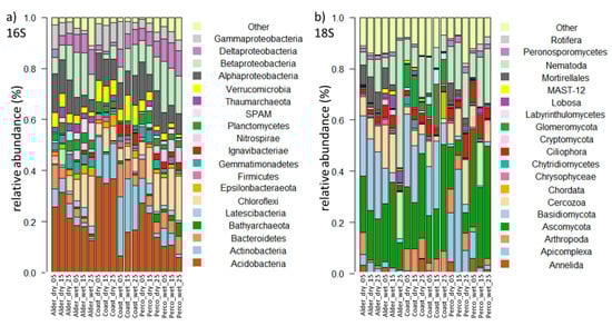 The data were processed using R version 3.5.1 [31]. The 16S rRNA and 18S rRNA gene amplicons were denoised using the dada2 pipeline [32]. The paired forward and reverse sequences were trimmed at 150 bp, and sequences failing to meet the quality check (maxN = 0, maxEE = 2, and truncQ = 2) were discarded. The filtered sequences were then, de-replicated, and clustered into amplicon sequence variants (ASVs) using the dada2 algorithm with default settings. The paired sequences were merged and chimeric sequences were de-novo checked and removed with dada2. The representative sequence of each ASV was then assigned to taxonomy against a modified version of the SILVA SSUref_NR_128 database, containing an updated taxonomy for Archaea [33], using the programs BLASTn [34] and Megan 5 [35]. ASVs that were assigned to chloroplast or mitochondria were removed. Due to the low number of sequences (<500) in one sample (Coastdry, core 2, 15–20 cm depth) for both 16S and 18S rRNA genes, this sample was discarded from further analysis. After filtering 1,134,953 and 3,990,919 sequences, sequences were retained and were clustered into 7697 and 5548 ASVs for 16S and 18S rRNA genes, respectively. Plant sequences in 18S rRNA genes, which accounted for 288 ASVs, were filtered for downstream analysis to increase the resolution of other eukaryotic taxa.