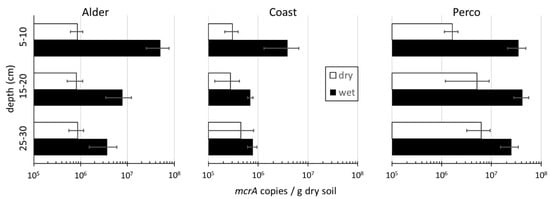 Abundance of methanogens. mcrA gene copy numbers per gram of dry soil based on qPCR. X-axis shows mcrA copies per g dry soil: drained sites in white, rewetted sites in black bars, and error bars show standard deviation of triplicate soil cores.