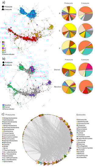Co-occurrence networks. (a) Co-occurrence network of indicator ASVs associated with (A) alder carr, (C) coastal fen, and (P) percolation fen, or with both alder carr and coastal fen (AC), both alder carr and percolation fen (AP), and both coastal fen and percolation fen (CP). (b) Co-occurrence network of indicator ASVs associated with drained and rewetted sites. (c) Co-occurrence network showing connections between prokaryotic and eukaryotic ASVs. ASVs with relative abundances lower than 0.05% were discarded. ASVs were identified as indicators associated with fen type or water condition using the indicspecies package [45], and are color-coded according to fen type and water condition (drained/rewetted) in (a) and (b), respectively. The relative abundances of prokaryotes and eukaryotes associated with the different fen types and water conditions are shown as pie charts on the right side of (a) and (b), respectively. The color code in pie charts of (a) and (b) correspond to the color code in (c). Solid lines indicate significant positive Spearman’s rank correlations (R > 0.7. p < 0.01), while dashed lines indicate significant negative correlations (R < −0.7. p < 0.01). Nodes are sized according to their degrees.